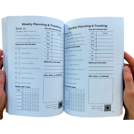 The Digital‑Connected Lifestyle Upgrade Journal is a printed habit and reflection system paired with free digital companions. You choose what to focus on each week across the 8 life pillars, then use the QR codes to unlock supporting tools in Notion, Google Sheets, and ChatGPT.